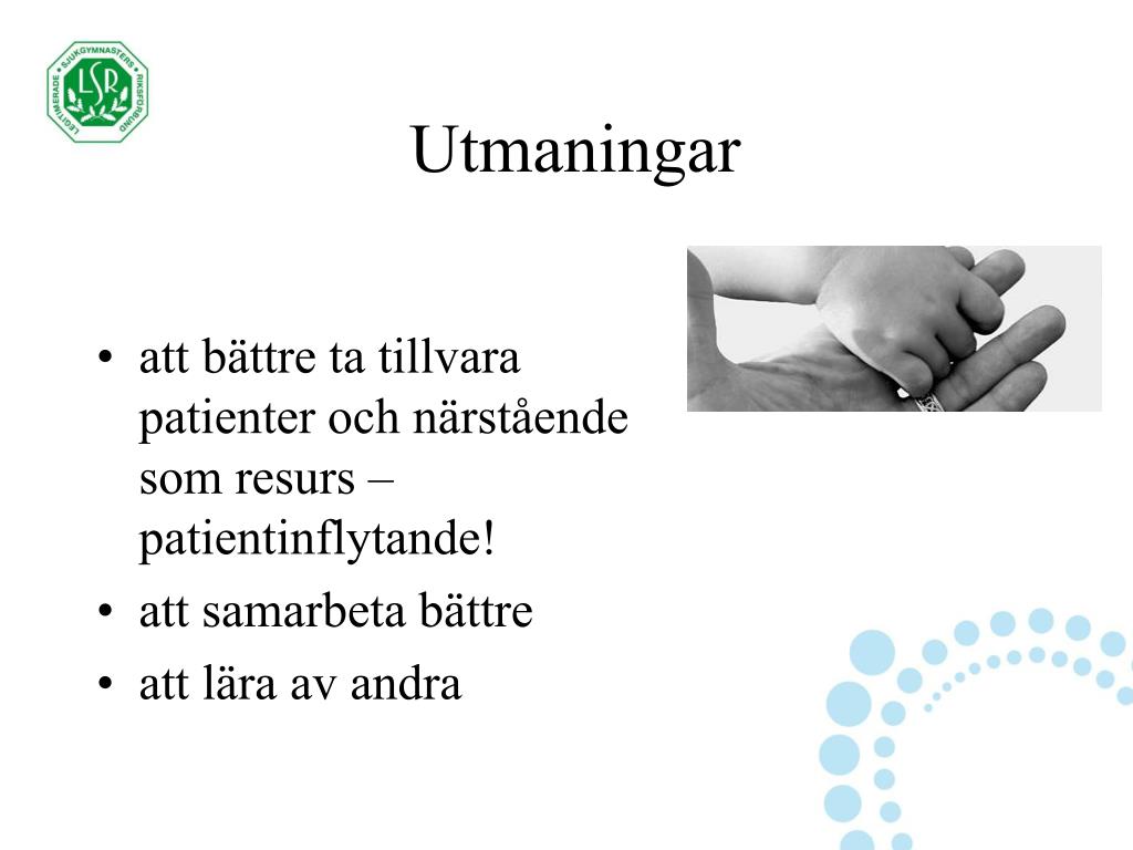 att bättre ta tillvara patienter och närståendesom resurs – patientinflytande! att samarbeta bättre att lära av andra Utmaningar