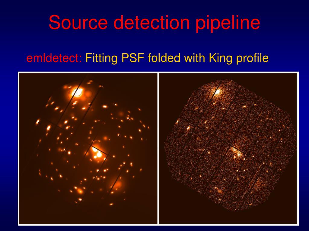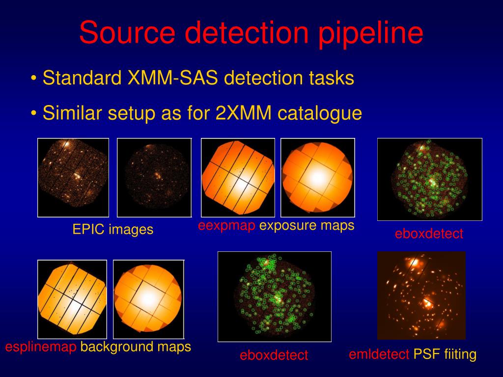 eexpmap exposure maps EPICimages eboxdetect esplinemap background maps emldetect PSF fiiting eboxdetect Source detection pipeline • Standard XMM-SAS detection tasks • Similar setup as for 2XMM catalogue