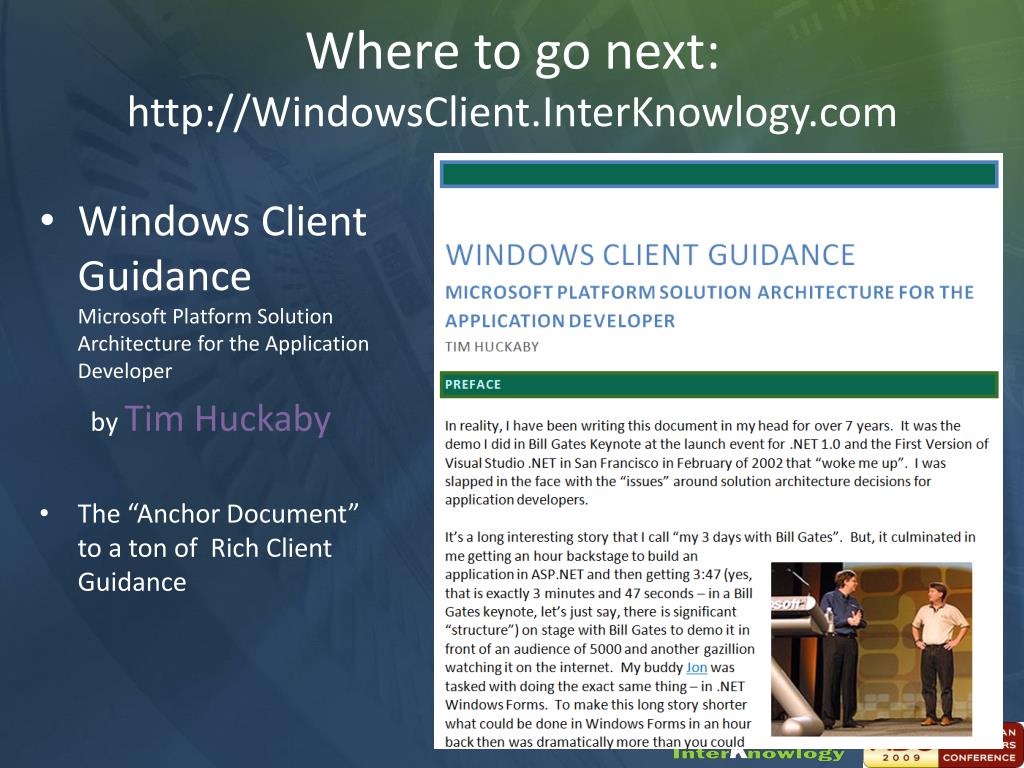 Where to go next:http://WindowsClient.InterKnowlogy.com • Windows Client Guidance Microsoft Platform Solution Architecture for the Application Developer by Tim Huckaby • The “Anchor Document” to a ton of Rich Client Guidance