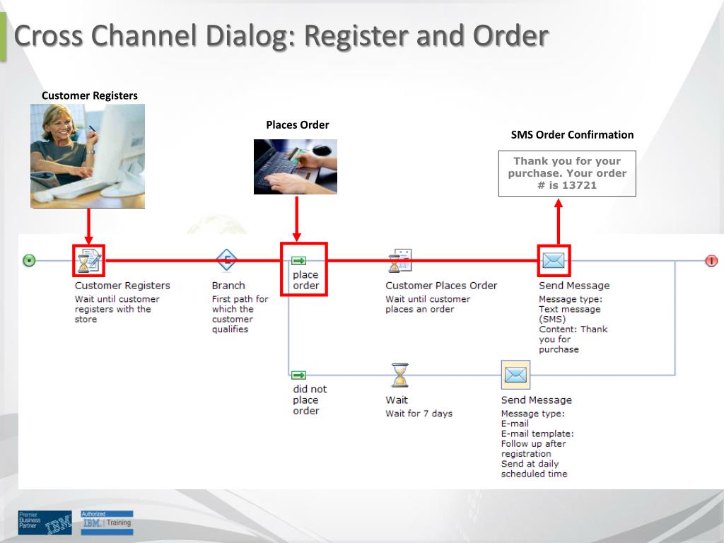 Customer Registers Places Order SMS Order Confirmation Thank you for your purchase. Your order # is 13721 Cross Channel Dialog: Register and Order