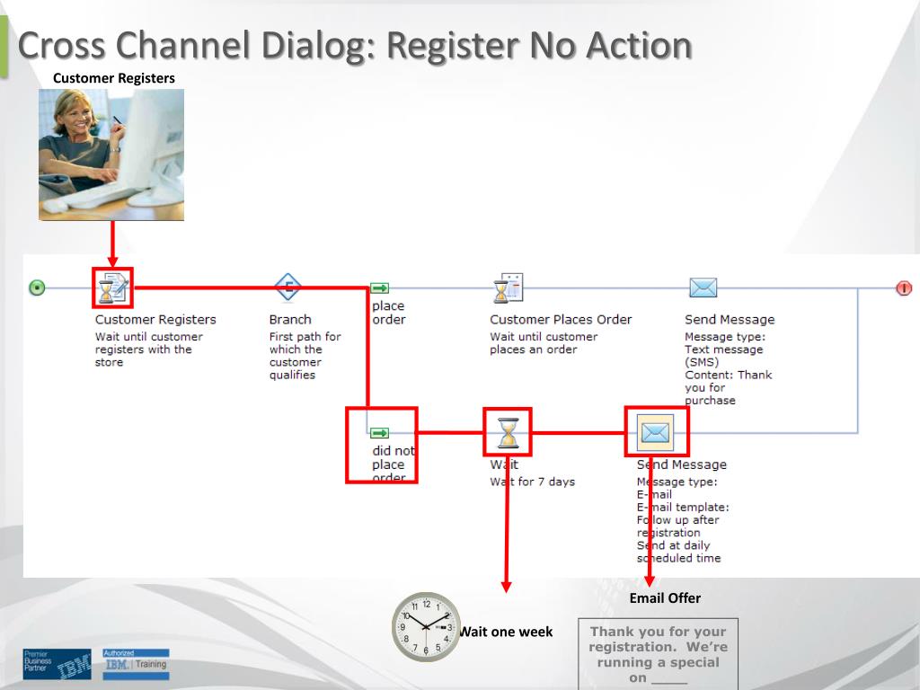Customer Registers Email Offer Thank you for your registration. We’re running a special on ____ Wait one week Cross Channel Dialog: Register No Action