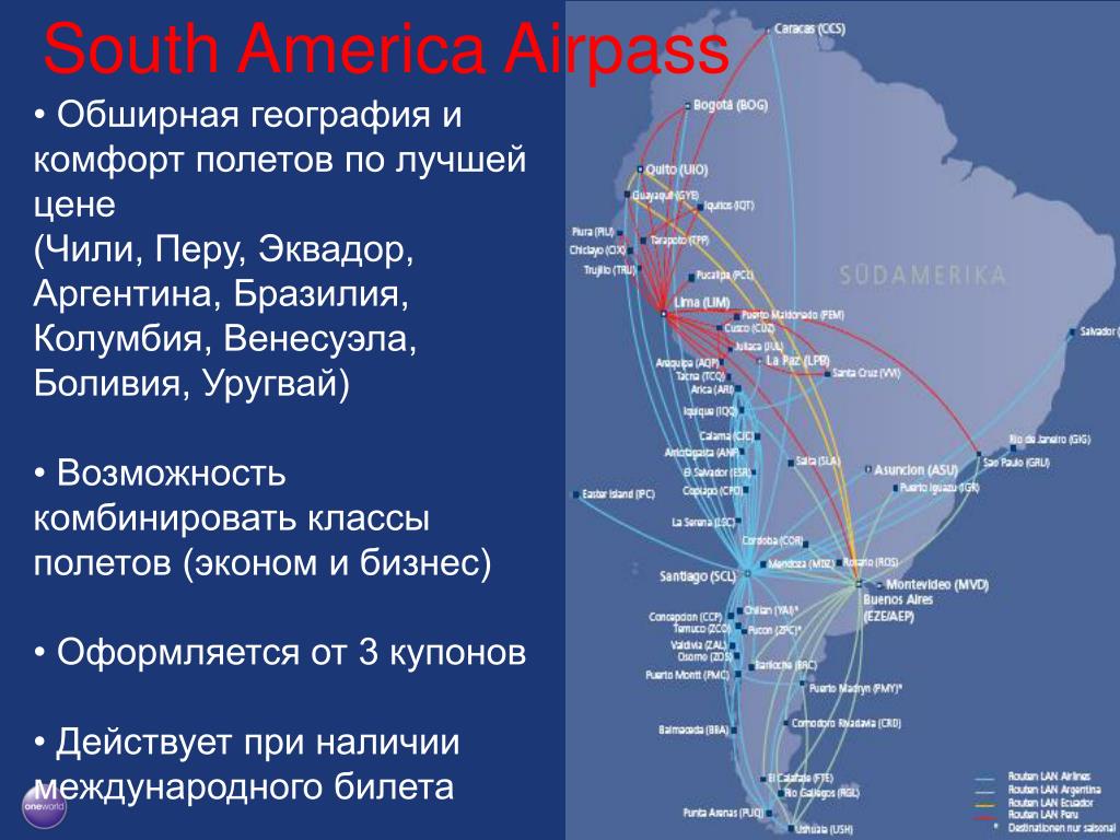 South AmericaAirpass • Обширная география и комфорт полетов по лучшей цене • (Чили, Перу, Эквадор, Аргентина, Бразилия, Колумбия, Венесуэла, Боливия, Уругвай) • Возможность комбинировать классы полетов (эконом и бизнес) • Оформляется от 3 купонов • Действует при наличии международного билета