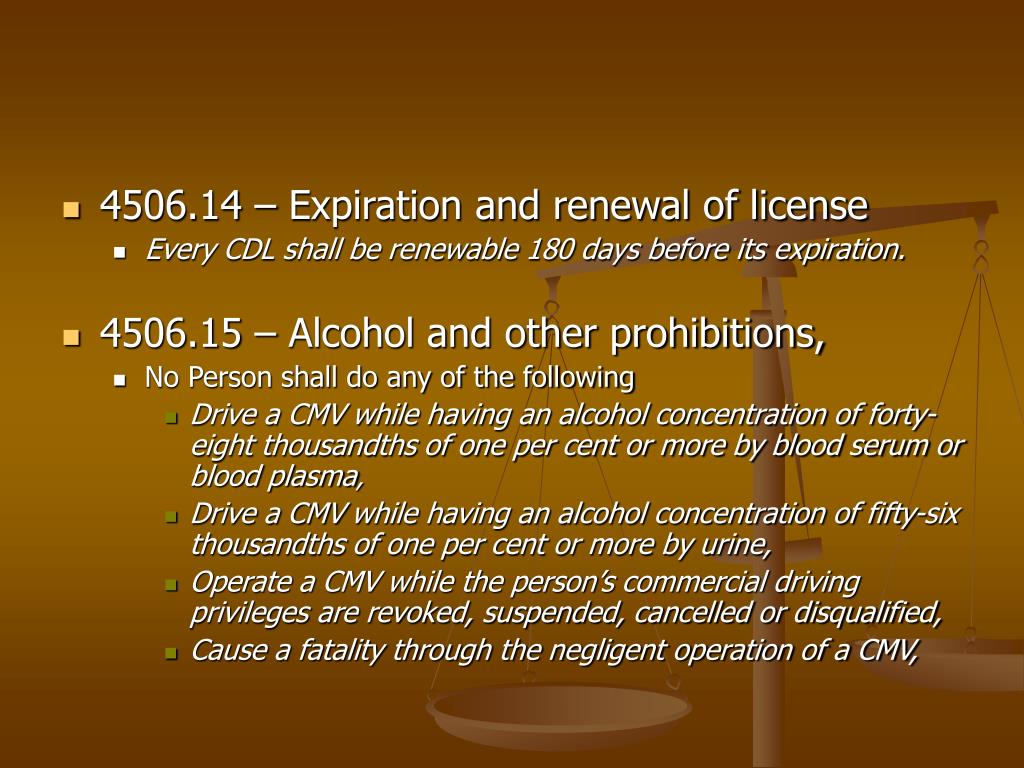 4506.14 – Expiration and renewal of license • Every CDL shall be renewable 180 days before its expiration. • 4506.15 – Alcohol and other prohibitions, • No Person shall do any of the following • Drive a CMV while having an alcohol concentration of forty-eight thousandths of one per cent or more by blood serum or blood plasma, • Drive a CMVwhile having an alcohol concentration of fifty-six thousandths of one per cent or more by urine, • Operate a CMV while the person’s commercial driving privileges are revoked, suspended, cancelled or disqualified, • Cause a fatality through the negligent operation of a CMV,