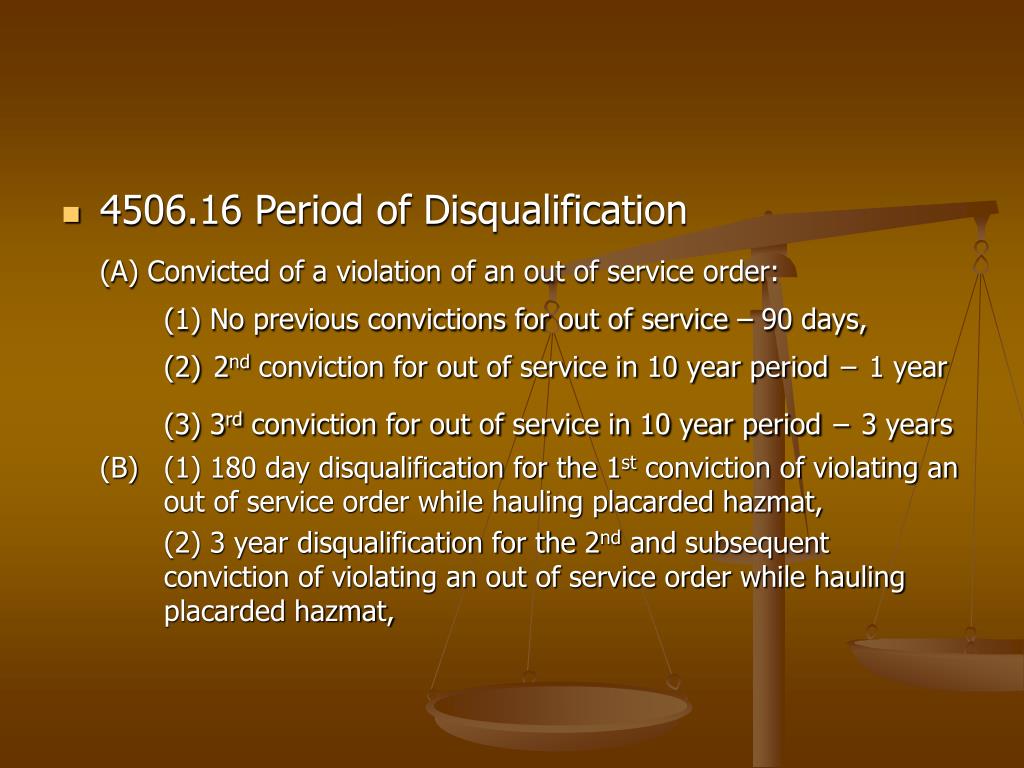 4506.16 Period of Disqualification (A) Convicted of a violation of an out of service order: (1) No previous convictions for out of service – 90 days,(2)2nd conviction for out of service in 10 year period–1 year (3) 3rd conviction for out of service in 10 year period–3 years (B) (1) 180 day disqualification for the 1st conviction of violating an out of service order while hauling placarded hazmat, (2) 3 year disqualification for the 2nd and subsequent conviction of violating an out of service order while hauling placarded hazmat,