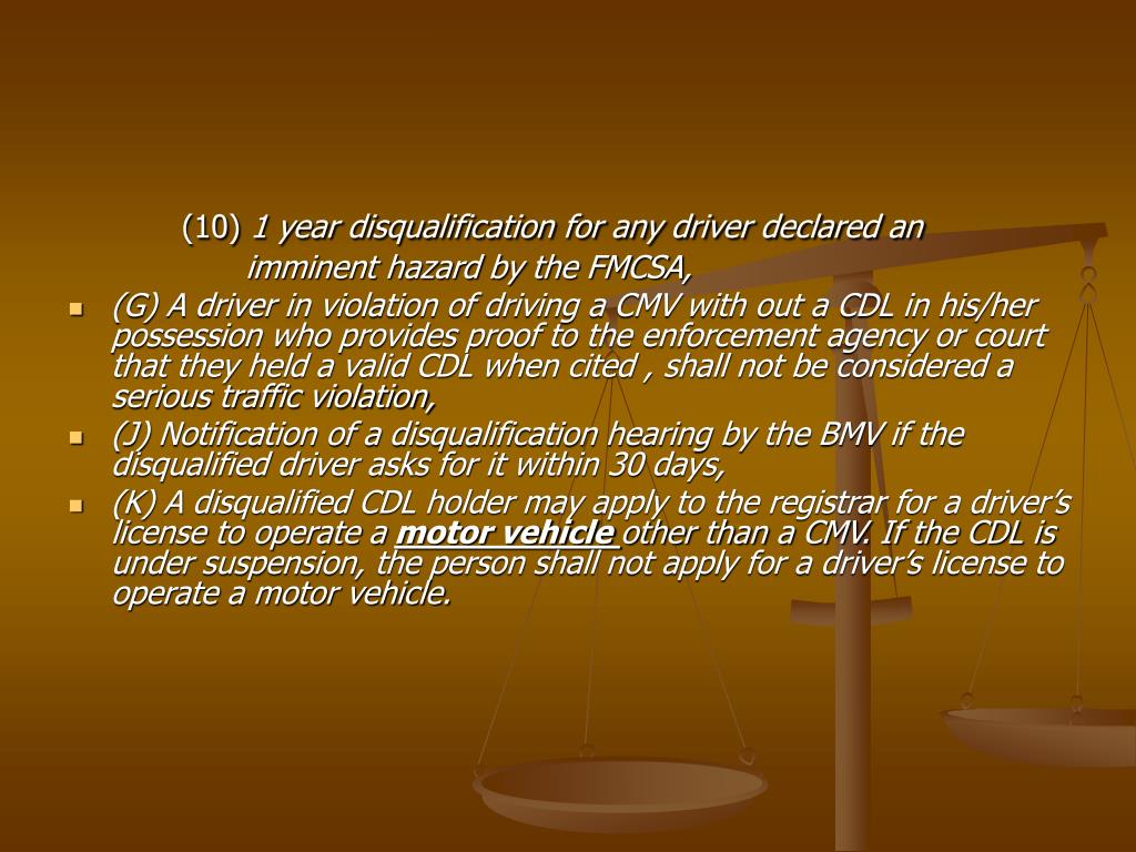(10) 1 year disqualification for any driver declared an imminent hazard by the FMCSA, • (G) A driver in violation of driving a CMV with out a CDL in his/her possession who provides proof to the enforcement agency or court that they held a valid CDL when cited , shall not be considered a serious traffic violation, • (J) Notification of a disqualification hearing by the BMV if the disqualified driver asks for it within 30 days, • (K) A disqualified CDL holder may apply to the registrar for a driver’s license to operate a motor vehicle other than a CMV. If the CDL is under suspension, the person shall not apply for a driver’s license to operate a motor vehicle.