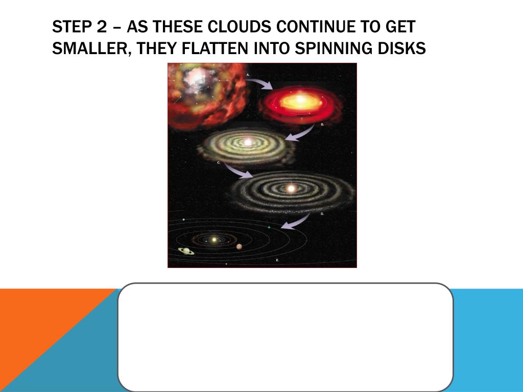Step 2 – As these clouds continue to get smaller, they flatten into spinning disks