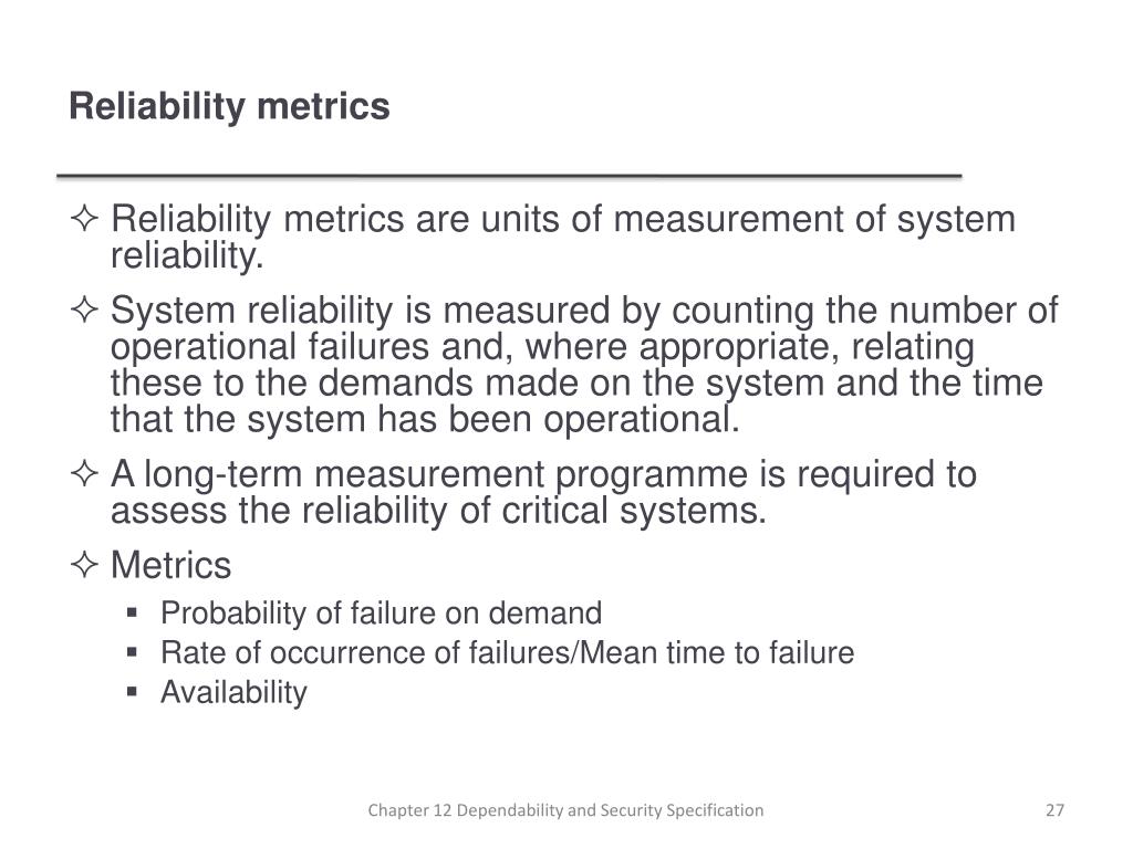 Reliability metrics • Reliability metrics are units of measurement of system reliability. • System reliability is measured by counting the number of operational failures and, where appropriate, relating these to the demands made on the system and the time that the system has been operational. • A long-term measurement programme is required to assess the reliability of critical systems. • Metrics • Probability of failure on demand • Rate of occurrence of failures/Mean time to failure • Availability Chapter 12 Dependability and Security Specification