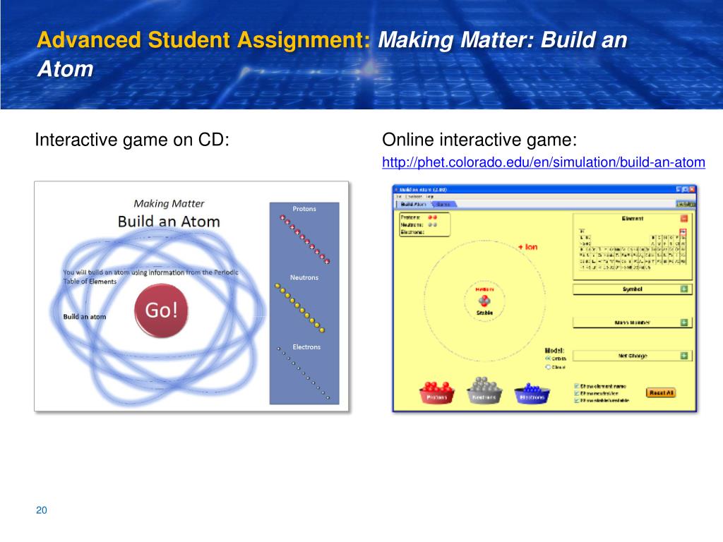 Advanced Student Assignment: Making Matter: Build an Atom Interactive game on CD: Online interactive game: http://phet.colorado.edu/en/simulation/build-an-atom