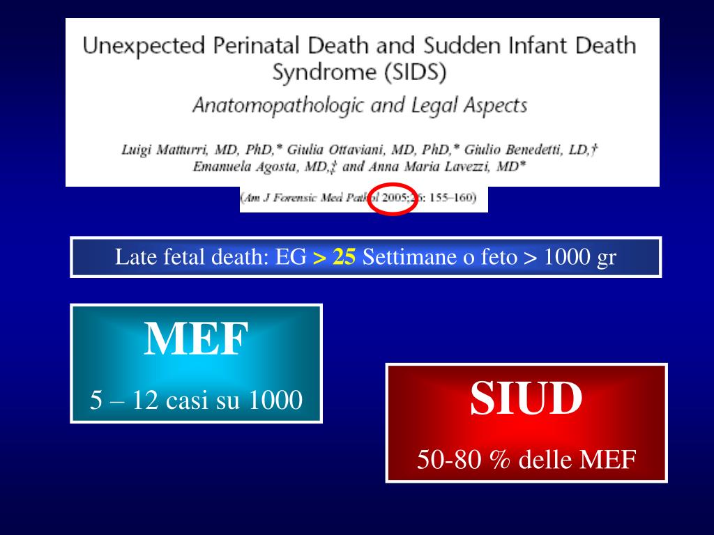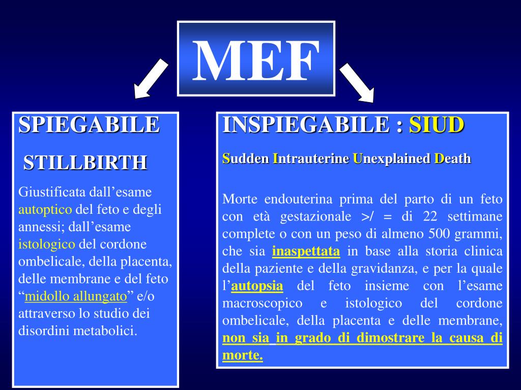MEF SPIEGABILE STILLBIRTH Giustificata dall’esame autoptico del feto e degli annessi; dall’esame istologico del cordone ombelicale, della placenta, delle membrane e del feto “midollo allungato” e/o attraverso lo studio dei disordini metabolici. INSPIEGABILE : SIUD Sudden Intrauterine Unexplained Death Morte endouterina prima del parto di un feto con età gestazionale >/ = di 22 settimane complete o con un peso di almeno 500 grammi, che sia inaspettata in base alla storia clinica della paziente e della gravidanza, e per la quale l’autopsia del feto insieme con l’esame macroscopico e istologico del cordone ombelicale, della placenta e delle membrane, non siain grado di dimostrare la causa di morte.