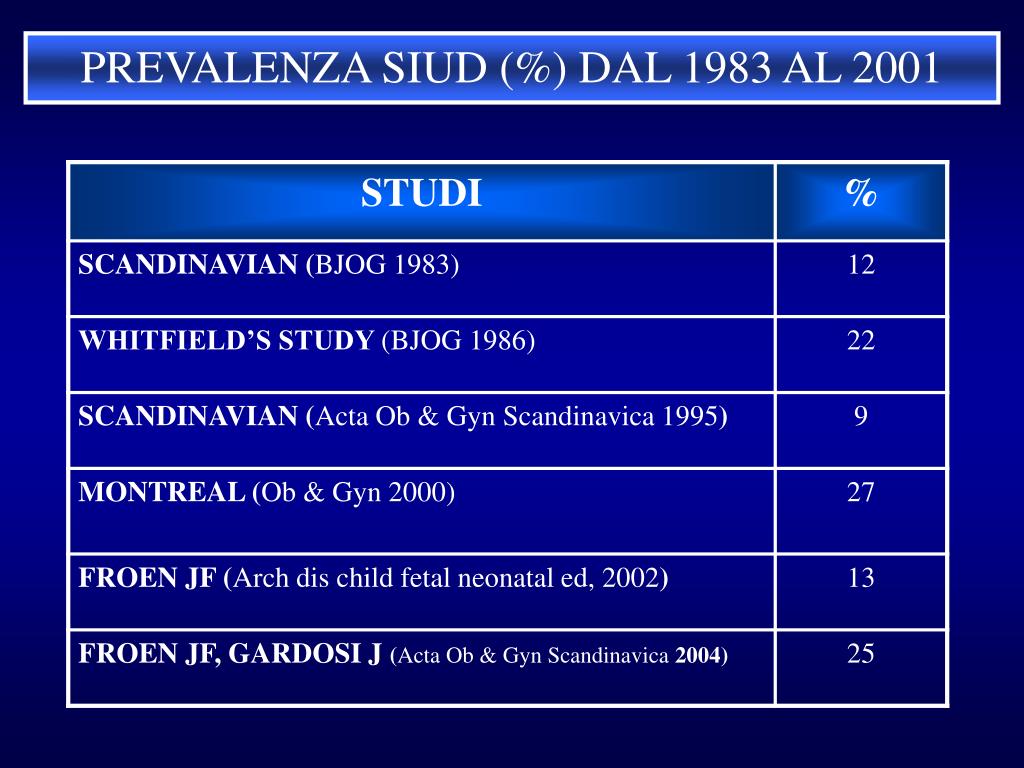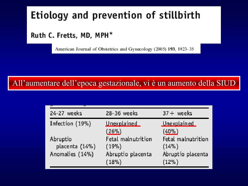 Late fetal death: EG > 25 Settimane o feto > 1000 gr MEF 5 – 12 casi su 1000 SIUD 50-80 % delle MEF