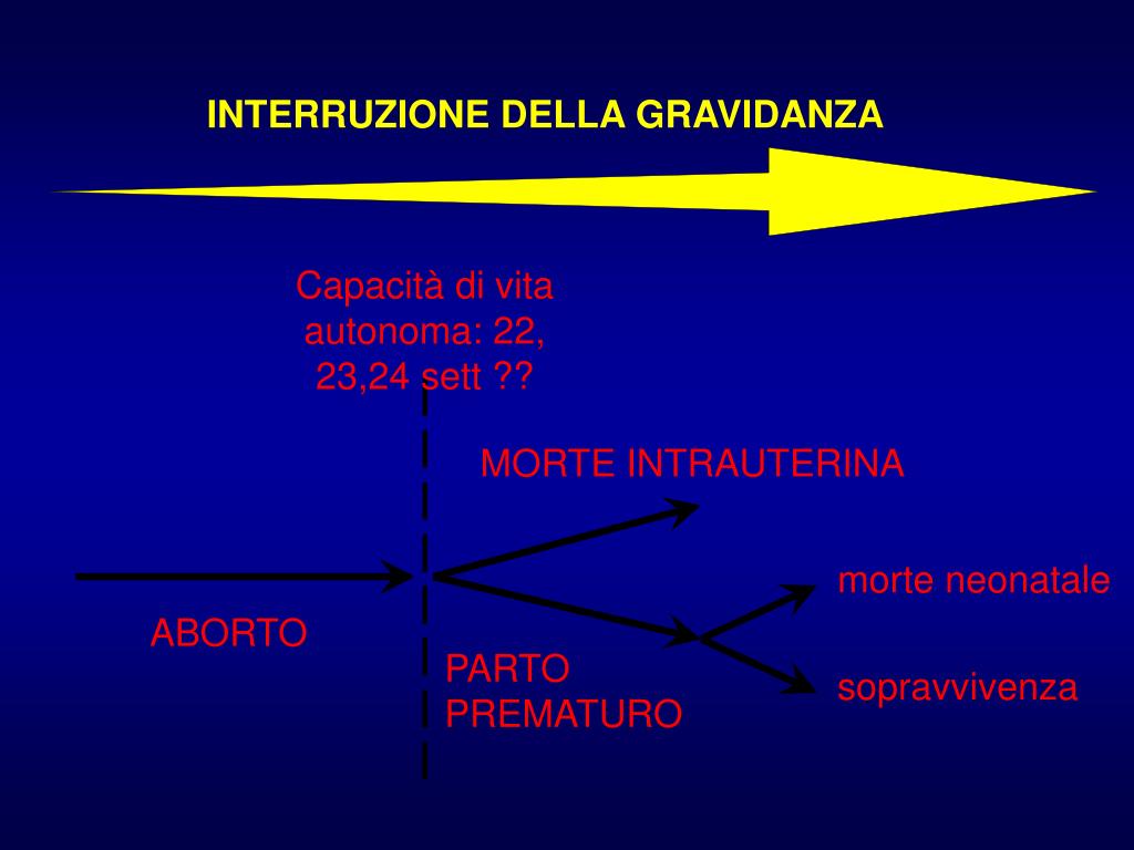 INTERRUZIONE DELLA GRAVIDANZA Capacità di vita autonoma: 22, 23,24 sett ?? MORTE INTRAUTERINA morte neonatale ABORTO PARTO PREMATURO sopravvivenza