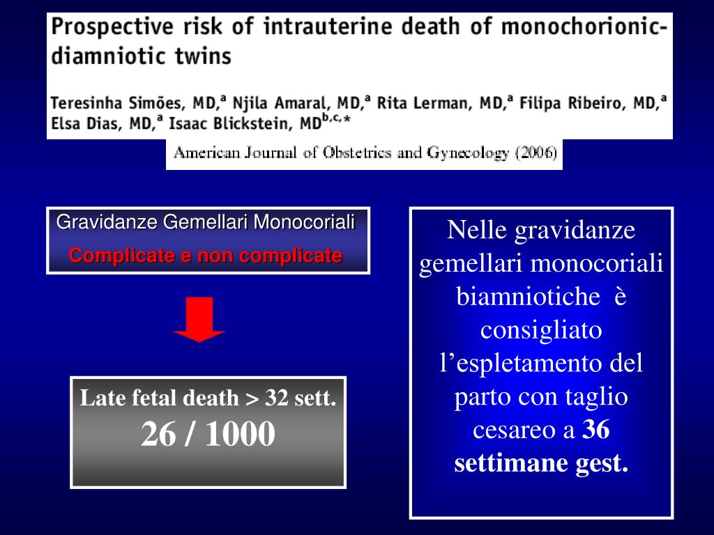 Gravidanze Gemellari Monocoriali Complicate e non complicate Nelle gravidanze gemellari monocoriali biamniotiche è consigliato l’espletamento del parto con taglio cesareo a 36 settimane gest. Late fetal death > 32 sett. 26 / 1000