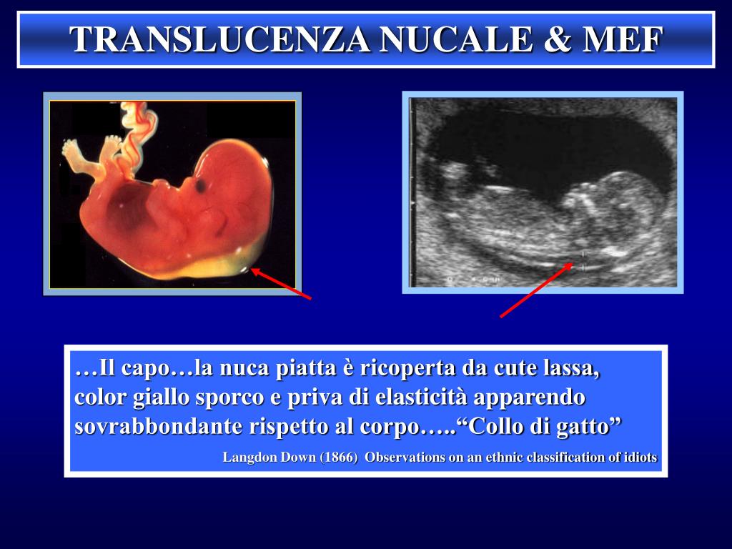 TRANSLUCENZA NUCALE & MEF …Il capo…la nuca piatta è ricoperta da cute lassa, color giallo sporco e priva di elasticità apparendo sovrabbondante rispetto al corpo…..“Collo di gatto” Langdon Down (1866) Observations on an ethnic classification of idiots