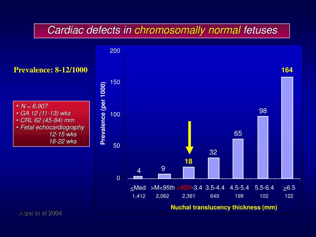 200 164 150 98 Prevalence (per 1000) 100 65 50 32 18 9 4 0 >M<95th >95th-3.4 3.5-4.4 4.5-5.4 5.5-6.4 >6.5 <Med 2,062 2,361 649 199 102 122 1,412 Nuchal translucency thickness (mm) Cardiac defects in chromosomally normal fetuses Prevalence: 8-12/1000 • N = 6,907 • GA 12 (11-13) wks • CRL 62 (45-84) mm • Fetal echocardiography • 12-15 wks • 16-22 wks Atzei et al 2004