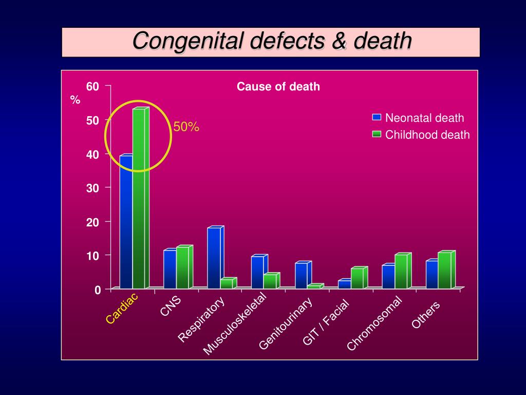 Neonatal death 50% Childhood death CNS Others Respiratory GIT / Facial Musculoskeletal Genitourinary Chromosomal Congenital defects & death 60 Cause of death % 50 40 30 20 10 0 Cardiac