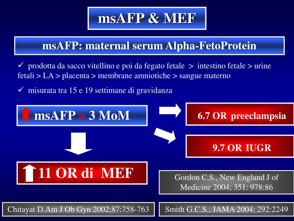 msAFP & MEF msAFP: maternal serum Alpha-FetoProtein • prodotta da sacco vitellino e poi da fegato fetale > intestino fetale > urine fetali > LA > placenta > membrane amniotiche > sangue materno • misurata tra 15 e 19 settimane di gravidanza 6.7 ORpreeclampsia msAFP > 3 MoM 9.7 ORIUGR 11 OR di MEF Gordon C.S., New England J of Medicine 2004; 351: 978:86 Chitayat D.Am J Ob Gyn 2002;87:758-763 Smith G.C.S., JAMA 2004; 292:2249