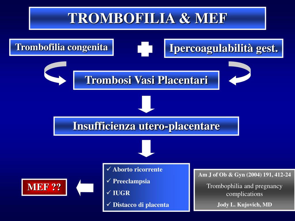 TROMBOFILIA & MEF Trombofilia congenita Ipercoagulabilità gest. Trombosi Vasi Placentari Insufficienza utero-placentare • Aborto ricorrente • Preeclampsia • IUGR • Distacco di placenta Am J of Ob & Gyn (2004) 191, 412-24 Trombophilia and pregnancy complications Jody L. Kujovich, MD MEF ??
