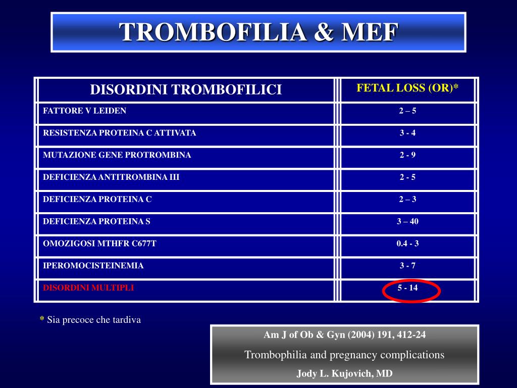 DISORDINI TROMBOFILICI FETAL LOSS (OR)* FATTORE V LEIDEN 2 – 5 RESISTENZA PROTEINA C ATTIVATA 3 - 4 MUTAZIONE GENE PROTROMBINA 2 - 9 DEFICIENZA ANTITROMBINA III 2 - 5 DEFICIENZA PROTEINA C 2 – 3 DEFICIENZA PROTEINA S 3 – 40 OMOZIGOSI MTHFR C677T 0.4 - 3 IPEROMOCISTEINEMIA 3 - 7 DISORDINI MULTIPLI 5 - 14 TROMBOFILIA & MEF *Sia precoce che tardiva Am J of Ob & Gyn (2004) 191, 412-24 Trombophilia and pregnancy complications Jody L. Kujovich, MD