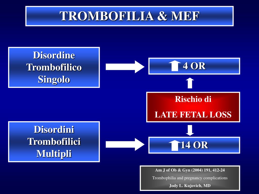TROMBOFILIA & MEF Disordine Trombofilico Singolo 4 OR Rischio di LATE FETAL LOSS Disordini Trombofilici Multipli 14 OR Am J of Ob & Gyn (2004) 191, 412-24 Trombophilia and pregnancy complications Jody L. Kujovich, MD