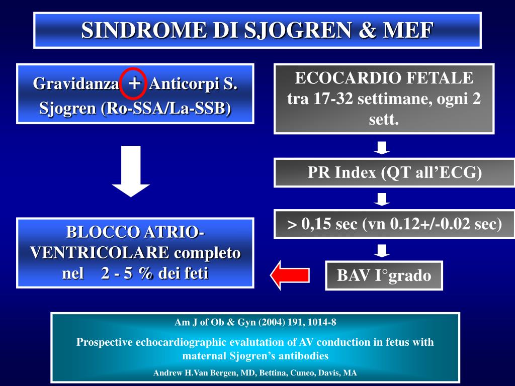 SINDROME DI SJOGREN & MEF Gravidanza + Anticorpi S. Sjogren (Ro-SSA/La-SSB) ECOCARDIO FETALE tra 17-32 settimane, ogni 2 sett. PR Index (QT all’ECG) > 0,15 sec (vn 0.12+/-0.02 sec) BLOCCO ATRIO-VENTRICOLARE completo nel 2 - 5 % dei feti BAV I°grado Am J of Ob & Gyn (2004) 191, 1014-8 Prospective echocardiographic evalutation of AV conduction in fetus with maternal Sjogren’s antibodies Andrew H.Van Bergen, MD, Bettina, Cuneo, Davis, MA