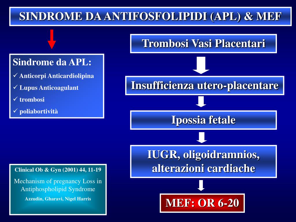 SINDROME DA ANTIFOSFOLIPIDI (APL) & MEF Trombosi Vasi Placentari • Sindrome da APL: • Anticorpi Anticardiolipina • Lupus Anticoagulant • trombosi • poliabortività Insufficienza utero-placentare c Ipossia fetale c IUGR, oligoidramnios, alterazioni cardiache Clinical Ob & Gyn (2001) 44, 11-19 Mechanism of pregnancy Loss in Antiphospholipid Syndrome Azzudin, Gharavi, Nigel Harris c MEF: OR 6-20