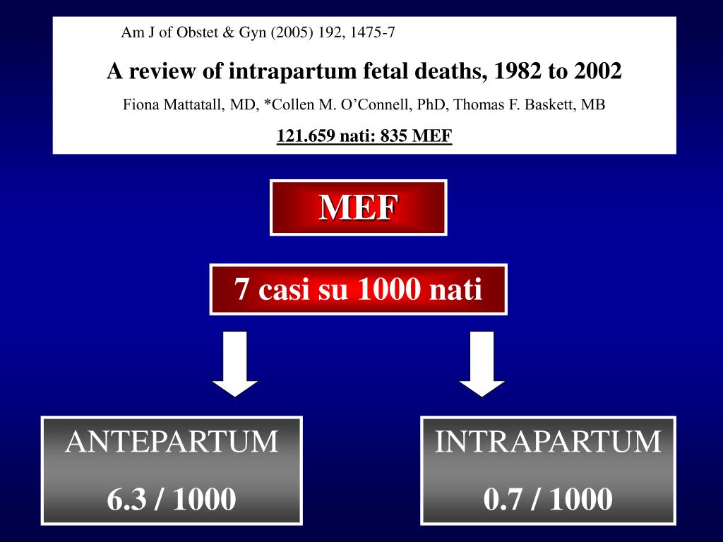 Am J of Obstet & Gyn (2005) 192, 1475-7 Areview of intrapartum fetal deaths, 1982 to 2002 Fiona Mattatall, MD, *Collen M. O’Connell, PhD, Thomas F. Baskett, MB 121.659 nati: 835 MEF MEF 7 casi su 1000 nati ANTEPARTUM 6.3 / 1000 INTRAPARTUM 0.7 / 1000