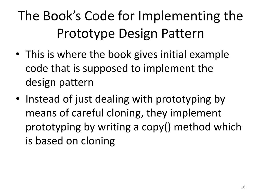 Book Definition of the Prototype Design Pattern • Book definition: • The intent of the Prototype pattern is to provide new objects by copying an example rather than by bringing forth new, uninitialized instances of a class.