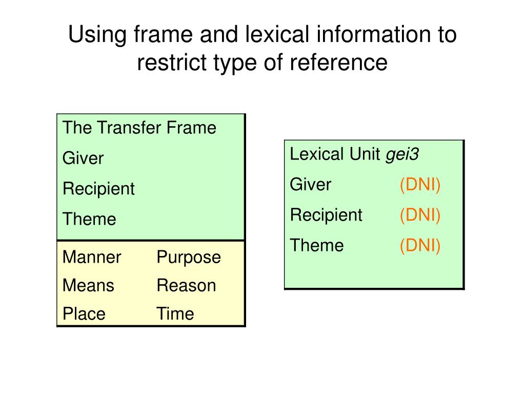 Combined score determines best-fit Syntactic Fit: Constituency relations Combine with preferences on non-local elements Conditioned on syntactic context Antecedent Fit: Ability to find referents in the context Conditioned on syntax match, feature agreement Semantic Fit: Semantic bindings for frame roles Frame roles’ fillers are scored