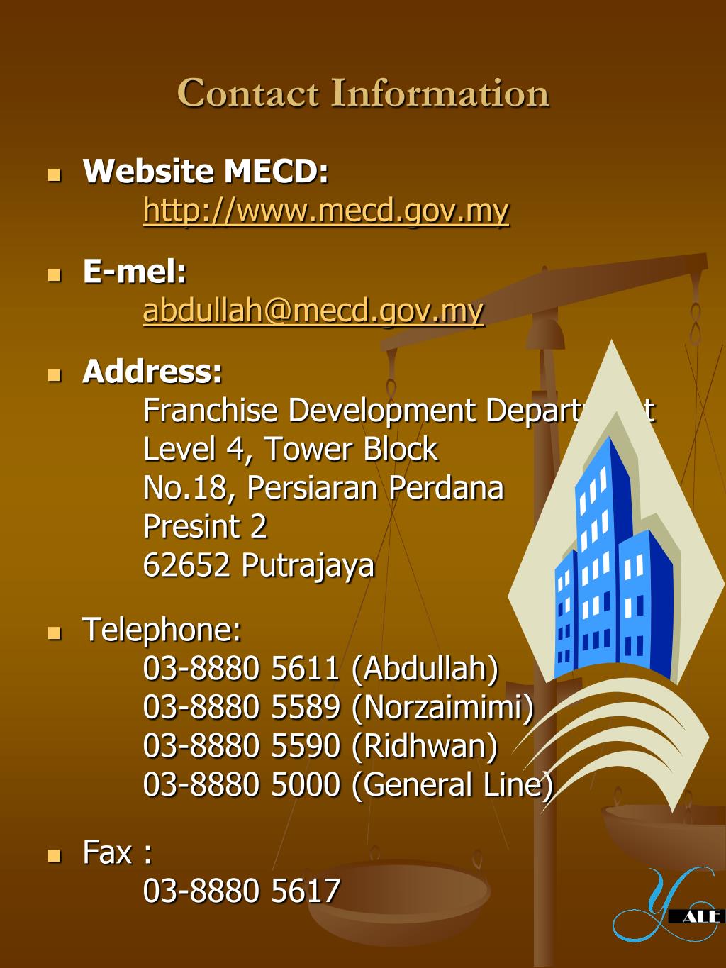 Contact Information • Website MECD: http://www.mecd.gov.my • E-mel: abdullah@mecd.gov.my • Address: Franchise Development Department Level 4, Tower Block No.18, Persiaran Perdana Presint 2 62652 Putrajaya • Telephone: 03-8880 5611 (Abdullah) 03-8880 5589 (Norzaimimi) 03-8880 5590 (Ridhwan) 03-8880 5000 (General Line) • Fax : 03-8880 5617