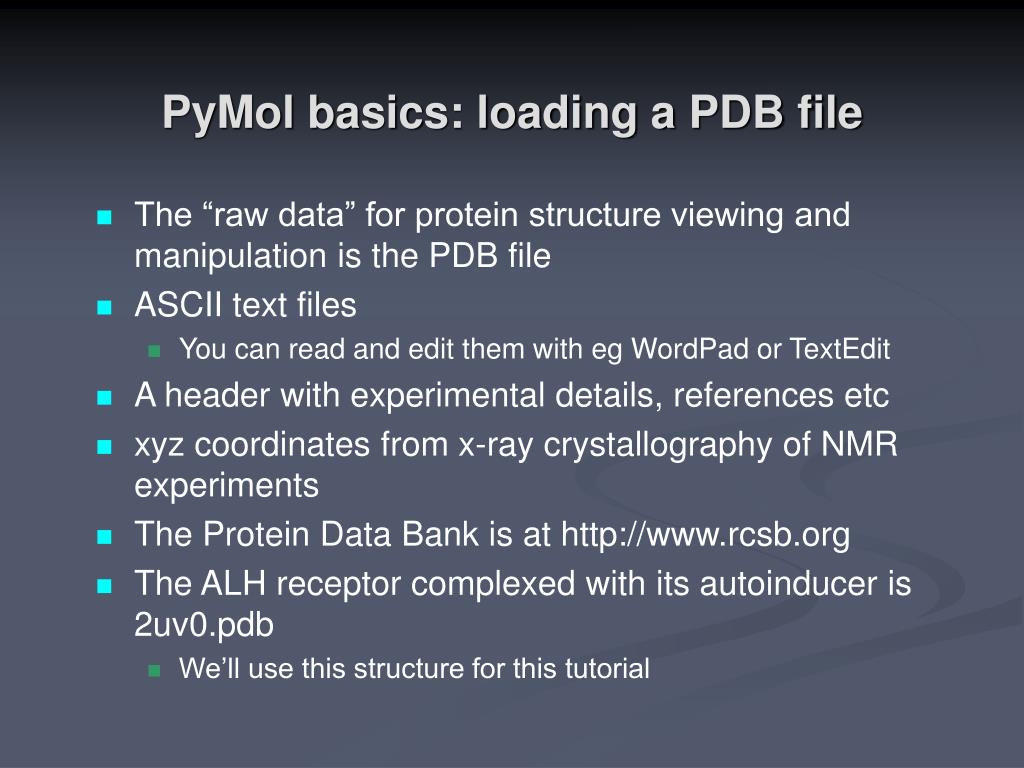 PyMol basics: loading a PDB file • The “raw data” for protein structure viewing and manipulation is the PDB file • ASCII text files • You can read and edit them with eg WordPad or TextEdit • A header with experimental details, references etc • xyz coordinates from x-ray crystallography of NMR experiments • The Protein Data Bank is at http://www.rcsb.org • The ALH receptor complexed with its autoinducer is 2uv0.pdb • We’ll use this structure for this tutorial