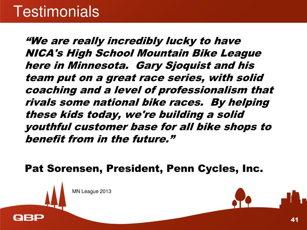 Testimonials “We are really incredibly lucky to have NICA's High School Mountain Bike League here in Minnesota. Gary Sjoquist and his team put on a great race series, with solid coaching and a level of professionalism that rivals some national bike races. By helping these kids today, we're building a solid youthful customer base for all bike shops to benefit from in the future.” Pat Sorensen, President, Penn Cycles, Inc.