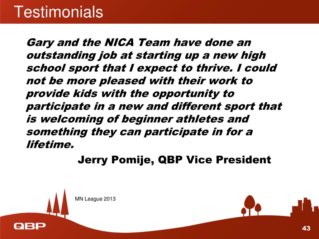 Testimonials Gary and the NICA Team have done an outstanding job at starting up a new high school sport that I expect to thrive. I could not be more pleased with their work to provide kids with the opportunity to participate in a new and different sport that is welcoming of beginner athletes and something they can participate in for a lifetime. Jerry Pomije, QBP Vice President