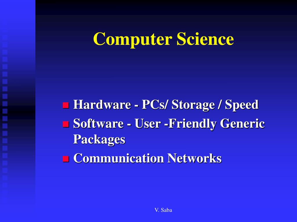 Computer Science • Hardware - PCs/ Storage / Speed • Software - User -Friendly Generic Packages • Communication Networks V. Saba