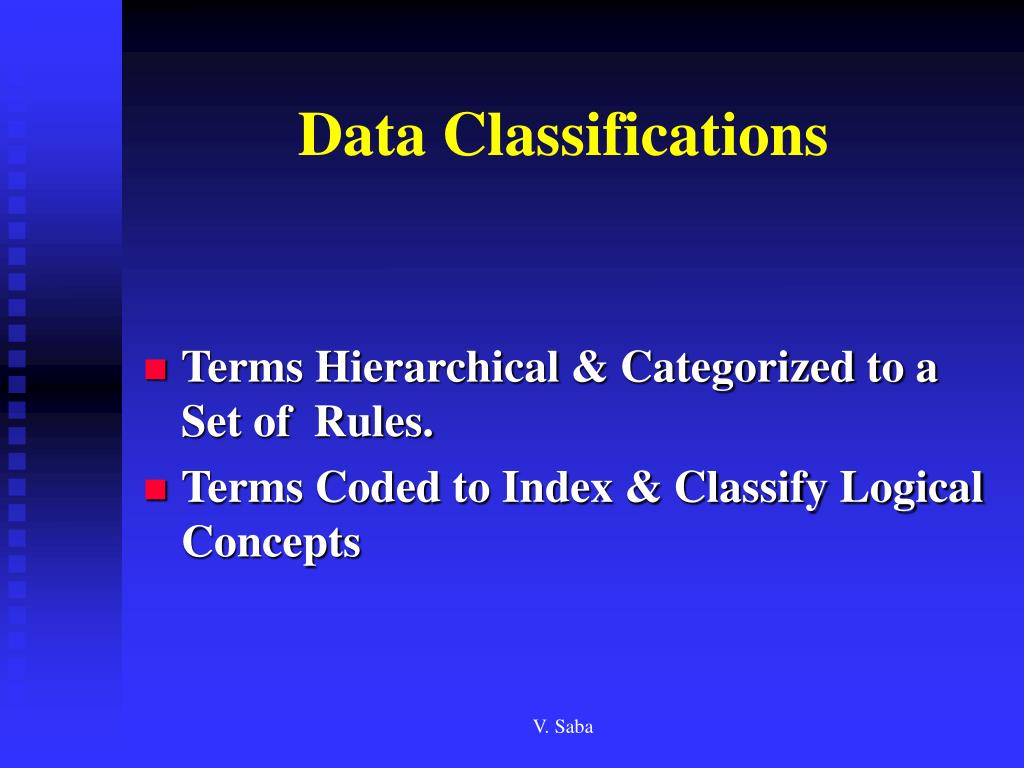 Data Classifications • Terms Hierarchical & Categorized to a Set of Rules. • Terms Coded to Index & Classify Logical Concepts V. Saba