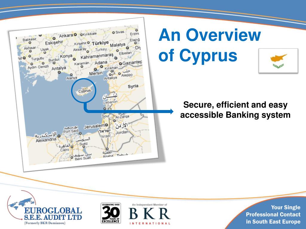 An Overview of Cyprus Secure, efficient and easy accessible Banking system Your Single Professional Contact in South East Europe