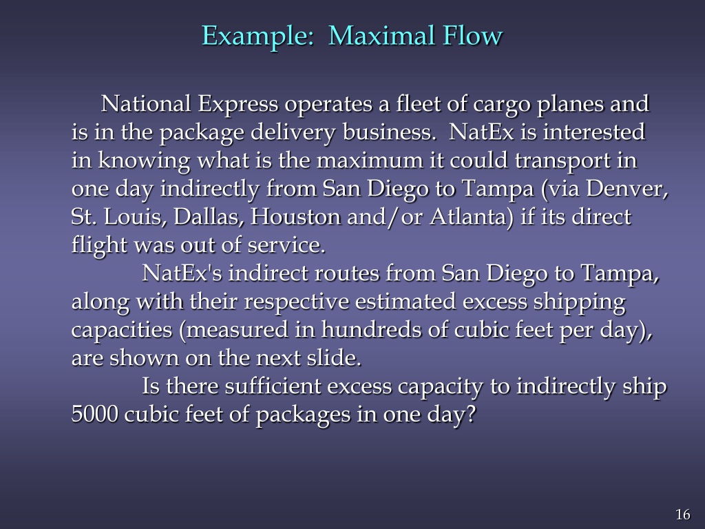 Example: Maximal Flow National Express operates a fleet of cargo planes and is in the package delivery business. NatEx is interested in knowing what is the maximum it could transport in one day indirectly from San Diego to Tampa (via Denver, St. Louis, Dallas, Houston and/or Atlanta) if its direct flight was out of service. NatEx'sindirect routes from San Diego to Tampa, along with their respective estimated excess shipping capacities (measured in hundreds of cubic feet per day), are shown on the next slide. Is there sufficient excess capacity to indirectly ship 5000 cubic feet of packages in one day?