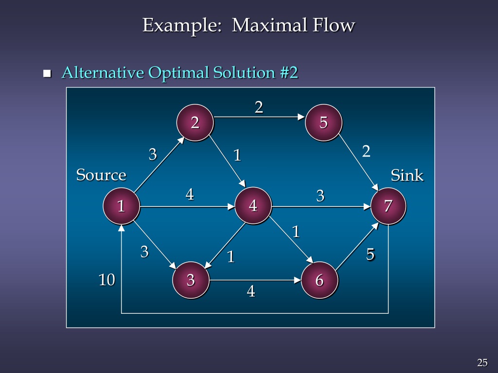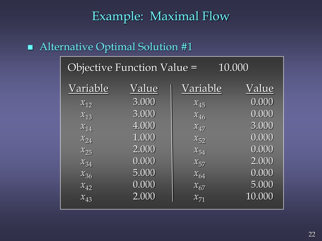 Example: Maximal Flow • Alternative Optimal Solution #1 Objective Function Value = 10.000 VariableValue x12 3.000 x13 3.000 x14 4.000 x24 1.000 x25 2.000 x34 0.000 x36 5.000 x42 0.000 x43 2.000 VariableValue x45 0.000 x46 0.000 x47 3.000 x52 0.000 x54 0.000 x57 2.000 x64 0.000 x67 5.000 x71 10.000