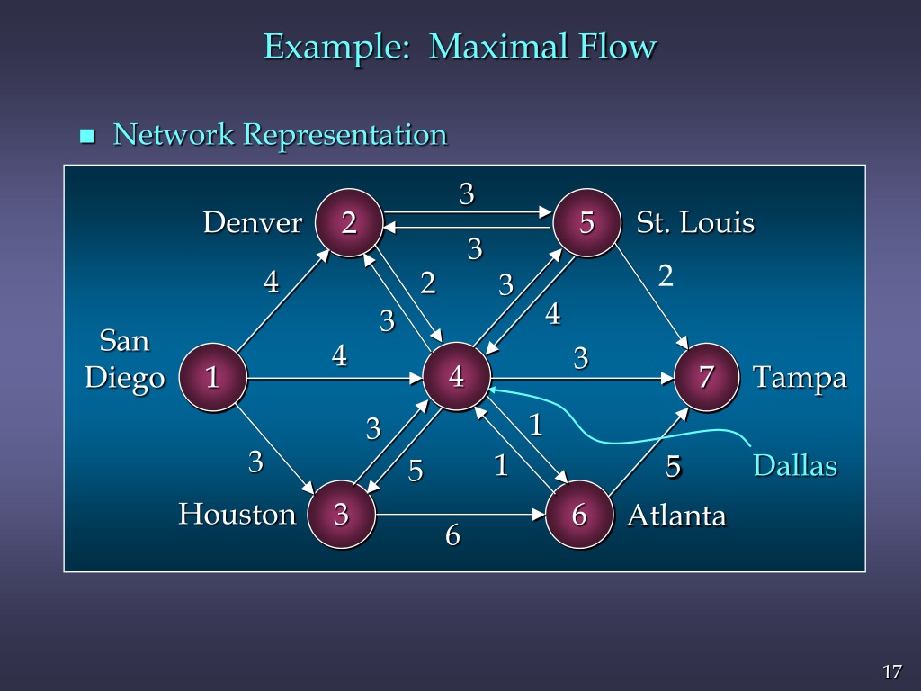 Example: Maximal Flow • Network Representation 3 2 5 Denver St. Louis 3 2 4 2 3 4 3 San Diego 4 3 4 1 7 Tampa 1 3 3 1 Dallas 5 5 3 6 Houston Atlanta 6