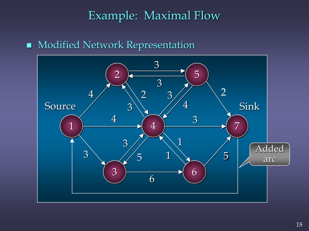 Example: Maximal Flow • Modified Network Representation 3 2 5 3 2 4 2 3 4 Source Sink 3 4 3 4 1 7 1 3 Added arc 3 1 5 5 3 6 6