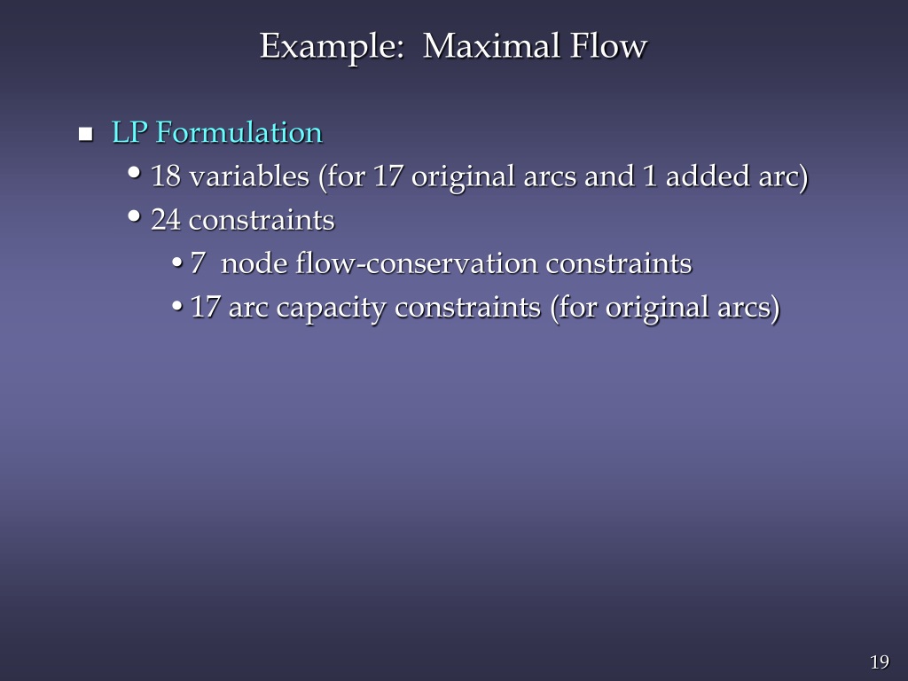 Example: Maximal Flow • LP Formulation • 18 variables (for 17 original arcs and 1 added arc) • 24 constraints • 7 node flow-conservation constraints • 17 arc capacity constraints (for original arcs)