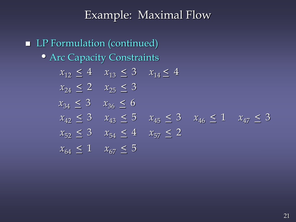 Example: Maximal Flow • LP Formulation • Objective Function Max x71 • Node Flow-Conservation Constraints x12 + x13 + x14 – x71 = 0 (node 1) – x12 + x24 + x25 – x42 – x52 = 0 (node 2) – x13 + x34 + x36 – x43 = 0 (and so on) – x14 – x24 – x34 + x42 + x43 + x45 + x46 + x47 – x54 – x64 = 0 – x25 – x45 + x52 + x54 + x57 = 0 – x36 – x46 + x64 + x67 = 0 – x47 – x57 – x67 + x71 = 0