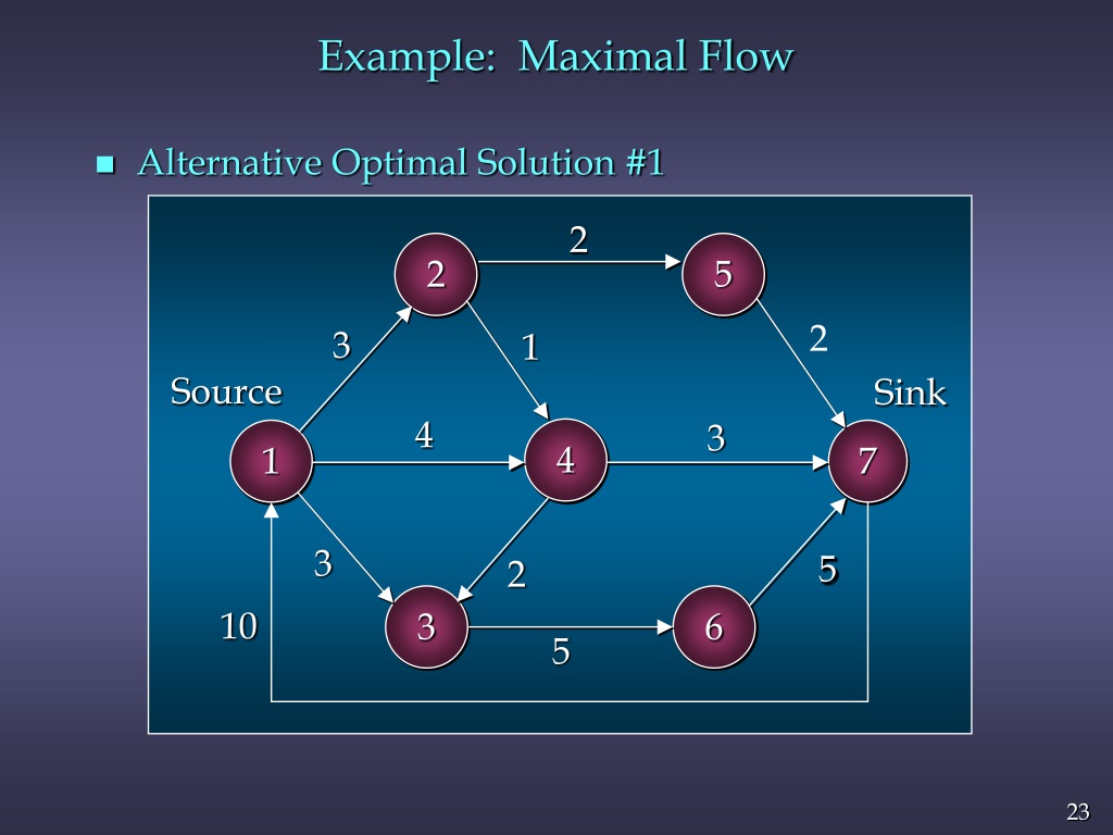 Example: Maximal Flow • Alternative Optimal Solution #2 Objective Function Value = 10.000 VariableValue x12 3.000 x13 3.000 x14 4.000 x24 1.000 x25 2.000 x34 0.000 x36 4.000 x42 0.000 x43 1.000 VariableValue x45 0.000 x46 1.000 x47 3.000 x52 0.000 x54 0.000 x57 2.000 x64 0.000 x67 5.000 x71 10.000