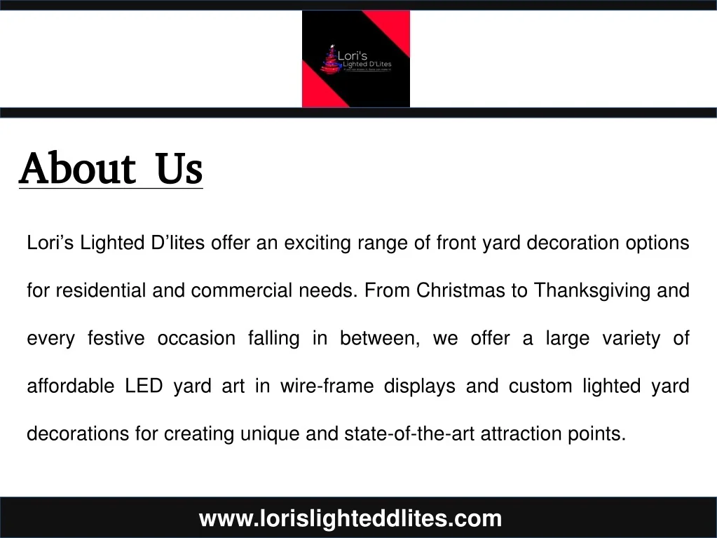 About Us Lori’s Lighted D’lites offer an exciting range of front yard decoration options for residential and commercial needs. From Christmas to Thanksgiving and every festive occasion falling in between, we offer a large variety of affordable LED yard art in wire-frame displays and custom lighted yard decorations for creating unique and state-of-the-art attraction points. www.lorislighteddlites.com
