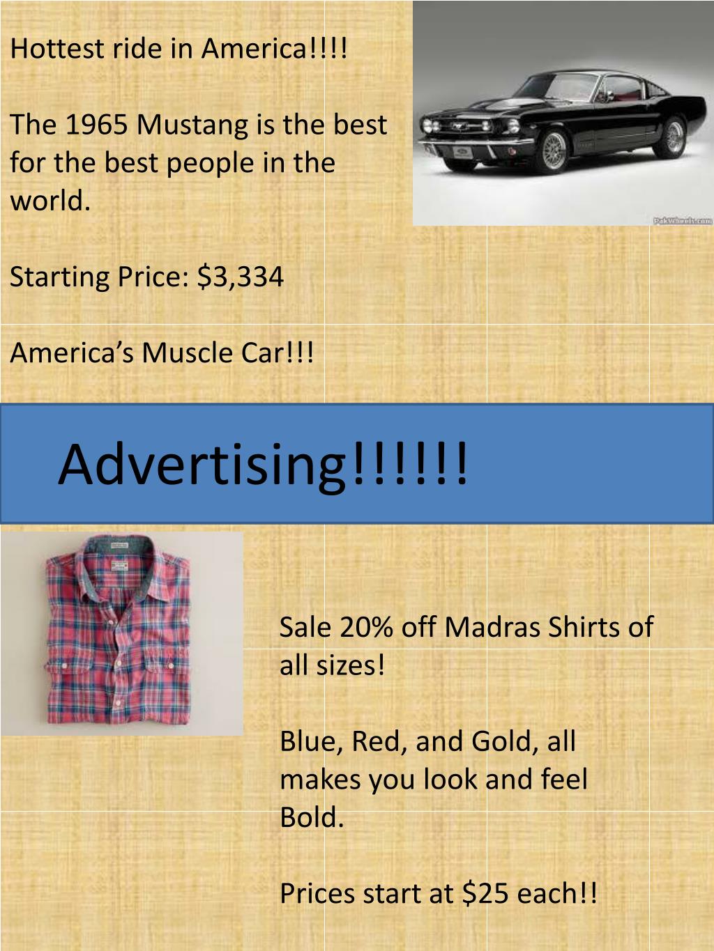 Hottest ride in America!!!! The 1965 Mustang is the best for the best people in the world. Starting Price: $3,334 America’s Muscle Car!!! Advertising!!!!!! Sale 20% off Madras Shirts of all sizes! Blue, Red, and Gold, all makes you look and feel Bold. Prices start at $25 each!!