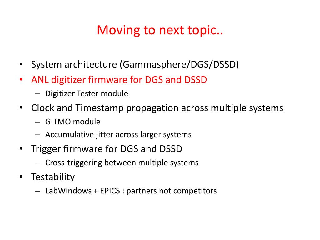 Moving to next topic.. • System architecture (Gammasphere/DGS/DSSD) • ANL digitizer firmware for DGS and DSSD • Digitizer Tester module • Clock and Timestamp propagation across multiple systems • GITMO module • Accumulative jitter across larger systems • Trigger firmware for DGS and DSSD • Cross-triggering between multiple systems • Testability • LabWindows + EPICS : partners not competitors