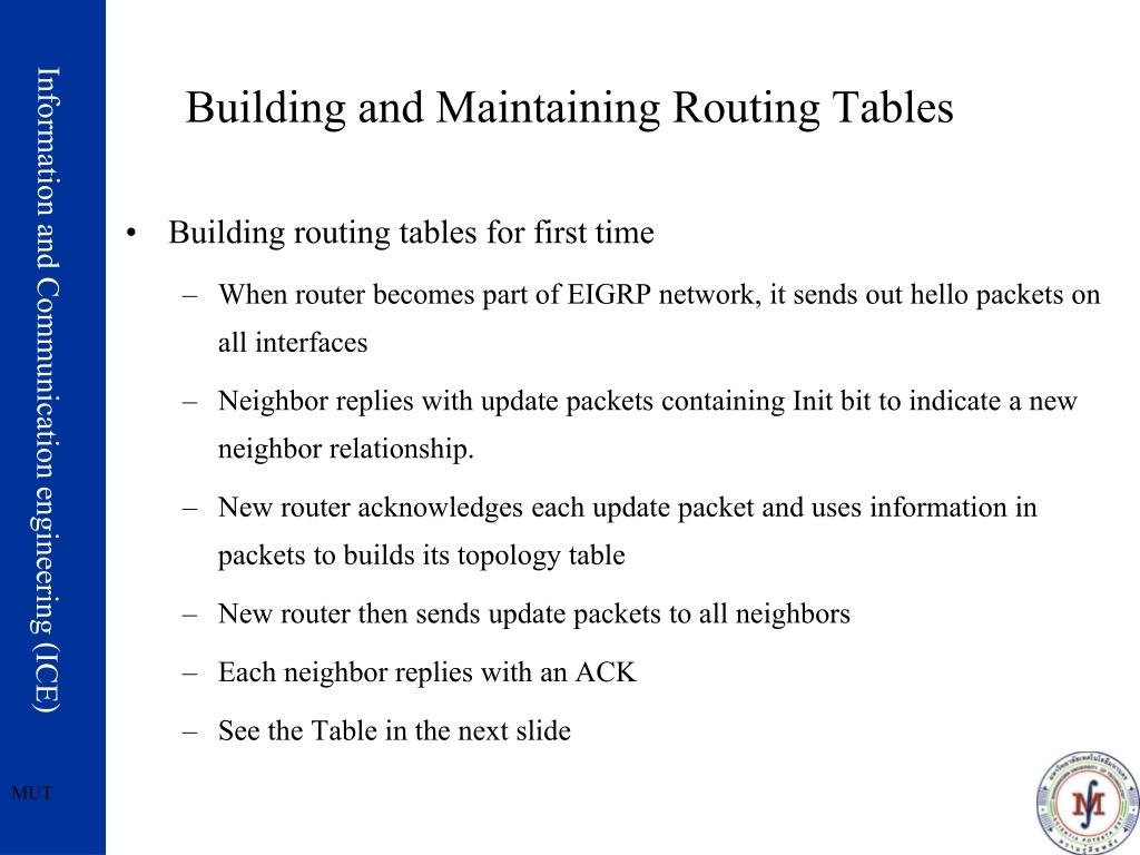 Building and Maintaining Routing Tables • Building routing tables for first time • When router becomes part of EIGRP network, it sends out hello packets on all interfaces • Neighbor replies with update packets containing Init bit to indicate a new neighbor relationship. • New router acknowledges each update packet and uses information in packets to builds its topology table • New router then sends update packets to all neighbors • Each neighbor replies with an ACK • Seethe Table in the next slide