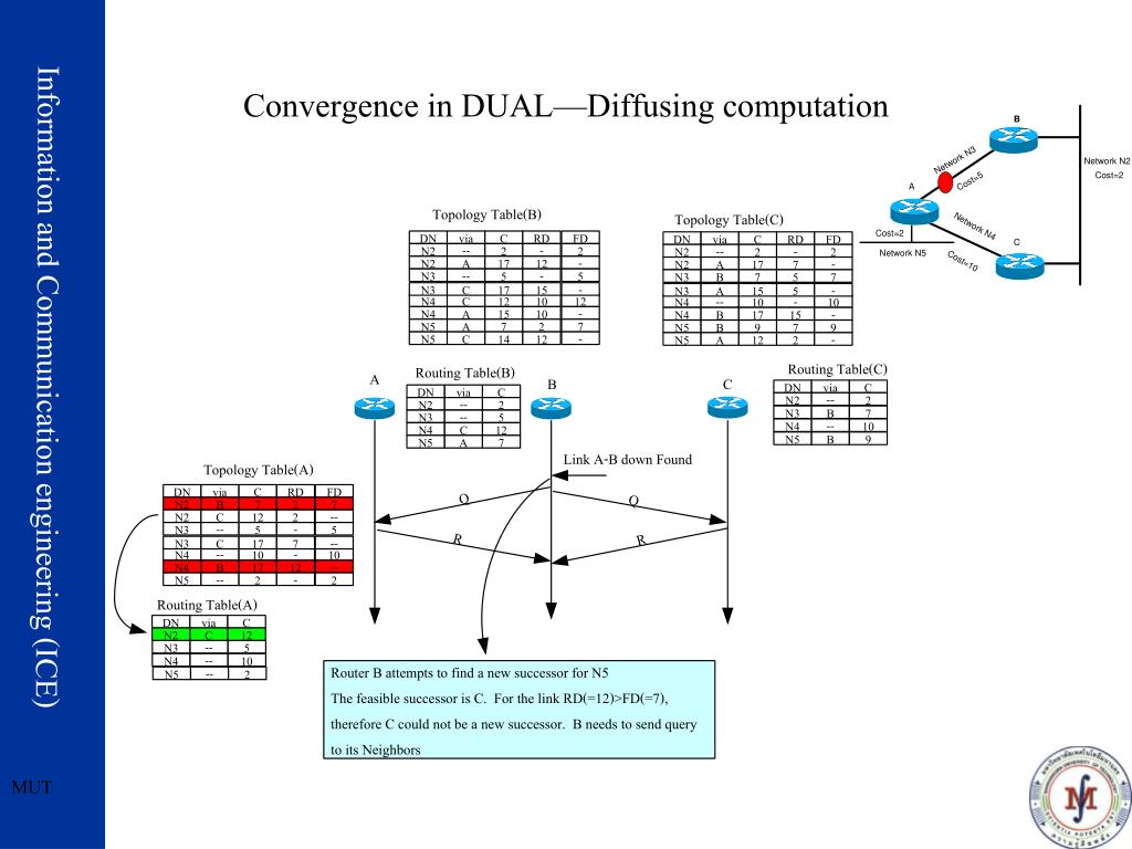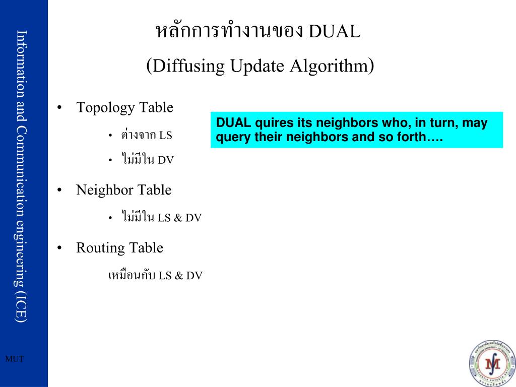 หลักการทำงานของ DUAL(Diffusing Update Algorithm) • Topology Table • ต่างจาก LS • ไม่มีใน DV • Neighbor Table • ไม่มีใน LS & DV • Routing Table เหมือนกับ LS & DV DUAL quires its neighbors who, in turn, may query their neighbors and so forth….
