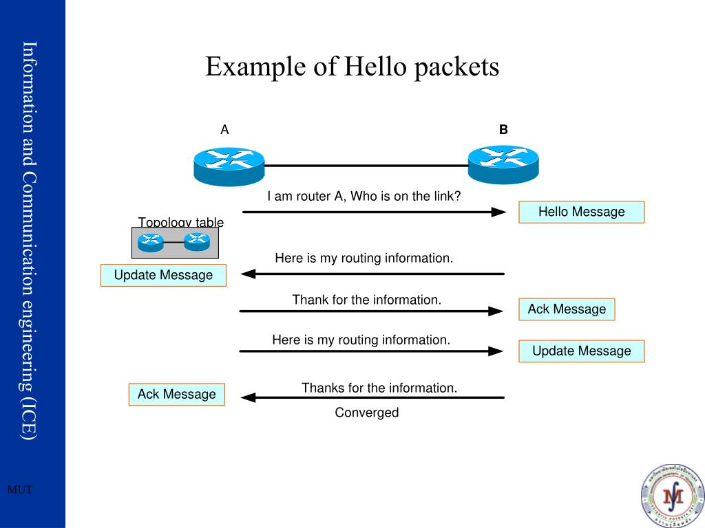 ตัวอย่าง The hold time=15 or 180 sec Hold = 10-15 sec, Hello interval =5 sec Hold = 120-180 sec, Hello interval =60 sec