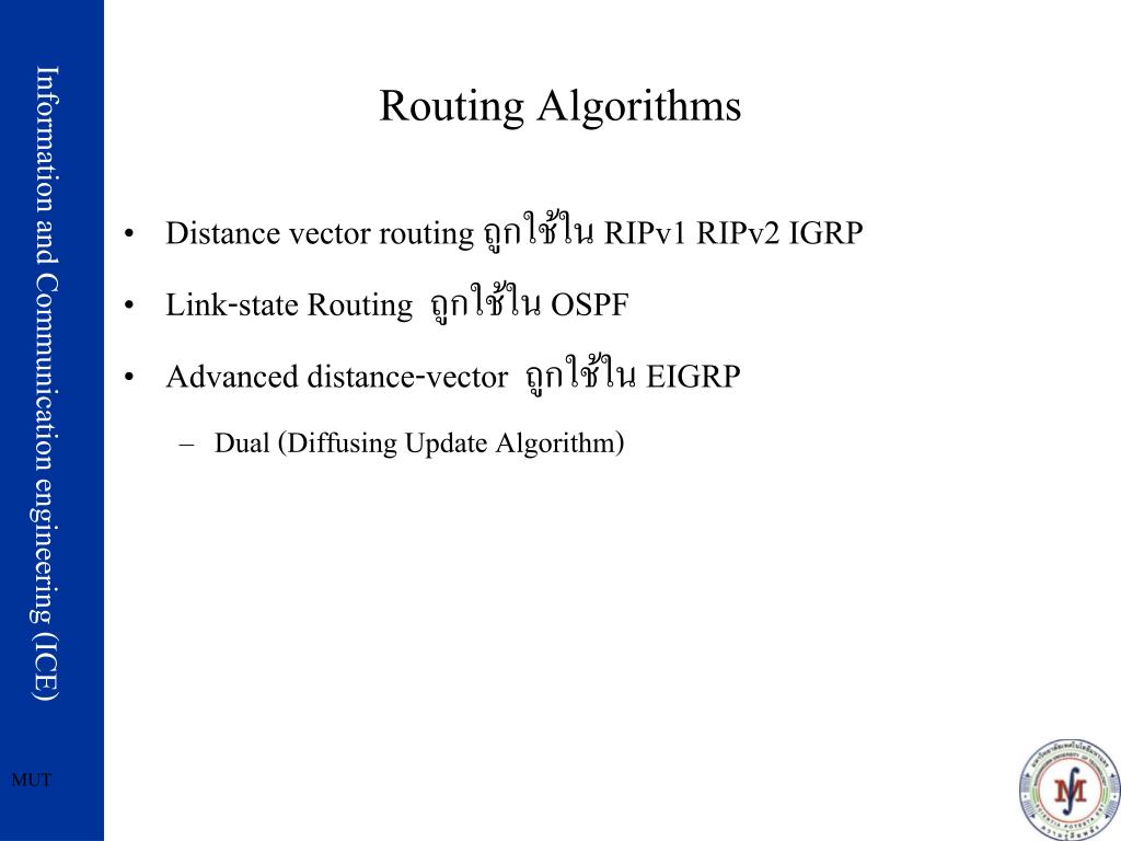 Routing Algorithms • Distance vector routing ถูกใช้ใน RIPv1 RIPv2 IGRP • Link-state Routing ถูกใช้ใน OSPF • Advanced distance-vector ถูกใช้ใน EIGRP • Dual (Diffusing Update Algorithm)