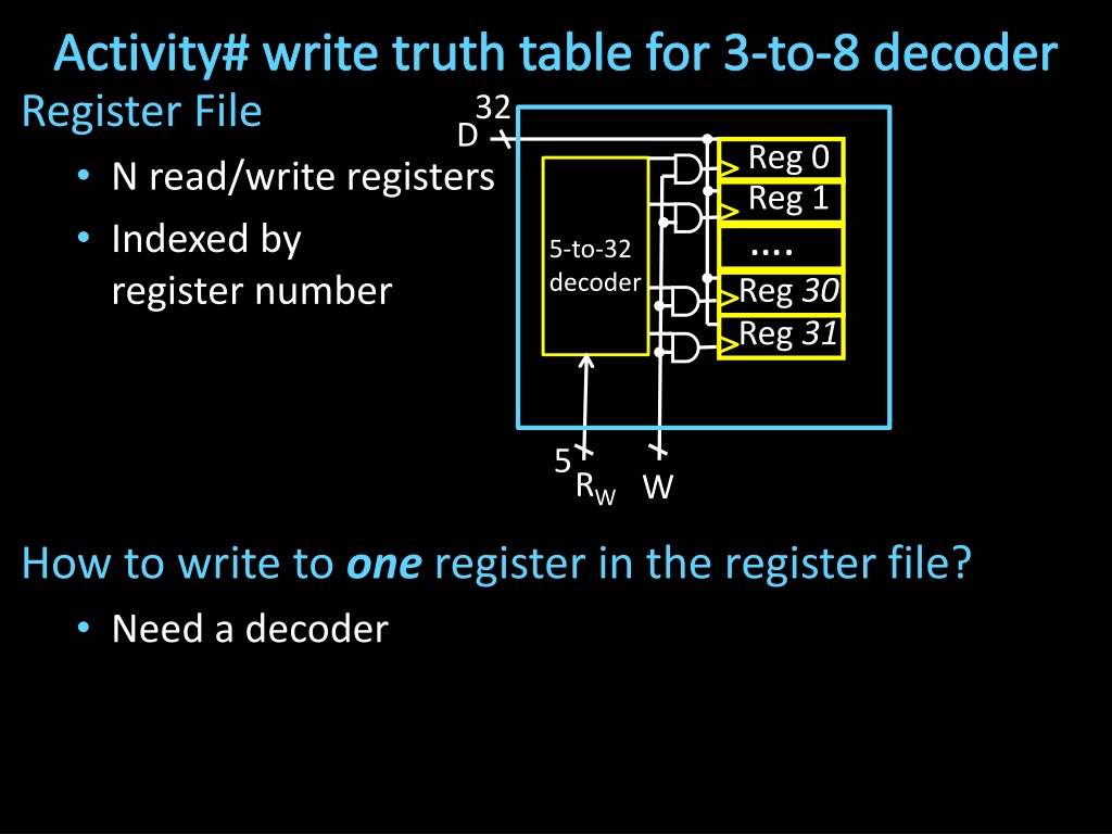 Activity# write truth table for 3-to-8 decoder 32 • Register File • N read/write registers • Indexed by register number • How to write to one register in the register file? • Need a decoder D …. Reg30 Reg31 Reg 1 Reg 0 5-to-32 decoder 5 RW W
